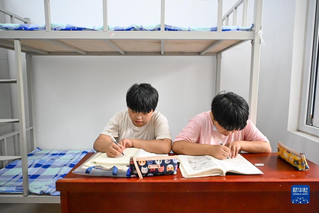 8月3日,在天津市静海区第六中学临时安置点,学生在写作业。