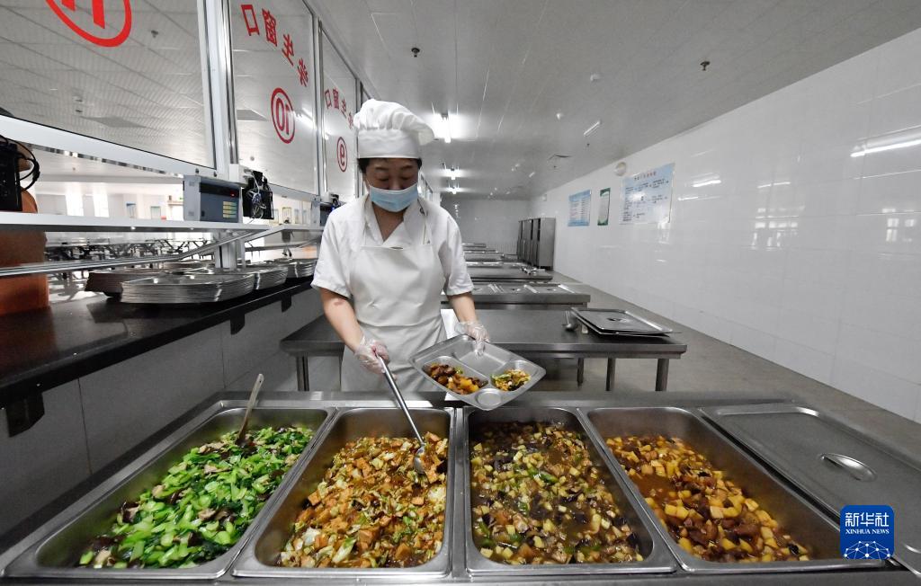 8月3日,在天津市静海区第六中学临时安置点,工作人员为转移群众准备午饭。
