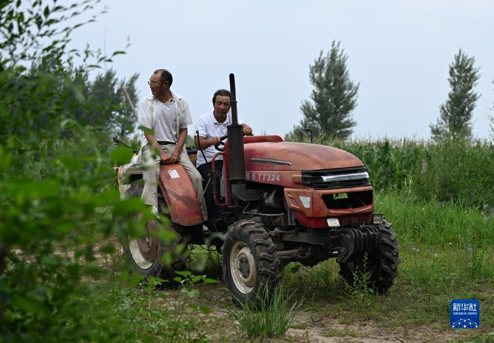 8月2日,百顺(左)和三儿子金柱开拖拉机去树林。