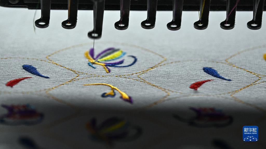 在靖西市非遗传承人王秀芬绣球制作车间,机器在绣花(8月2日摄)。