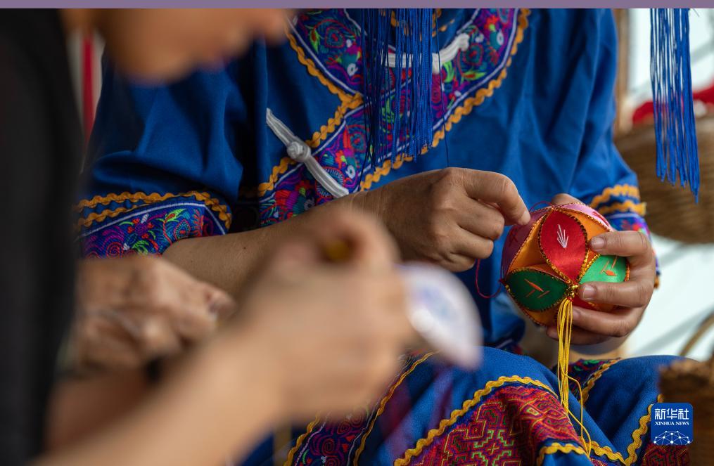 8月2日,在靖西市旧州村,村民在制作绣球。