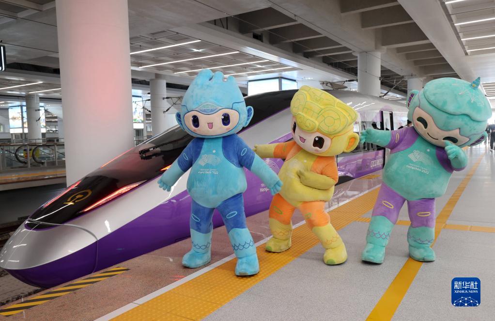 8月4日,在浙江省杭州西站,杭州亚运会吉祥物“琮琮”“莲莲”“宸宸”与复兴号亚运智能动车组列车合影留念。