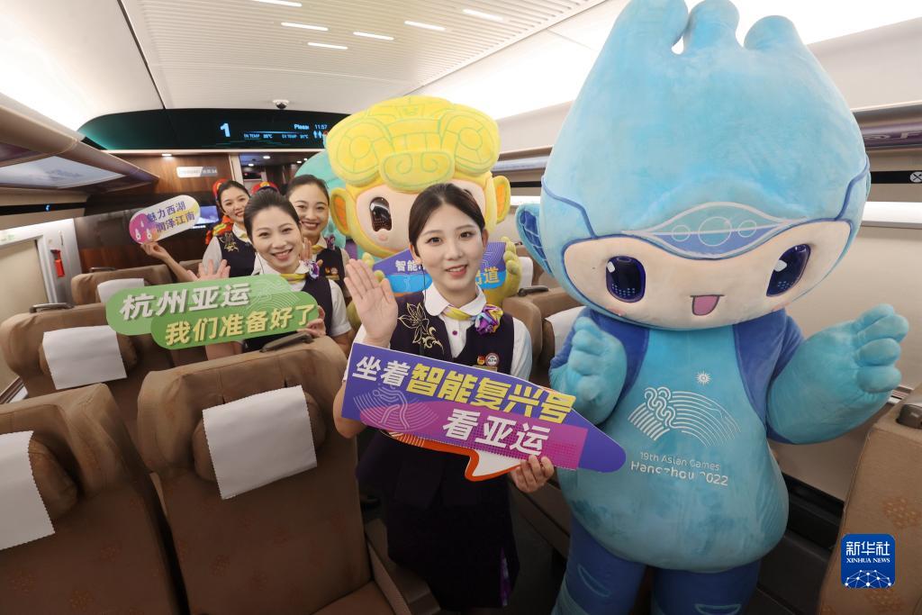 8月4日,乘务员在列车上与杭州亚运会吉祥物“琮琮”“莲莲”“宸宸”合影留念。