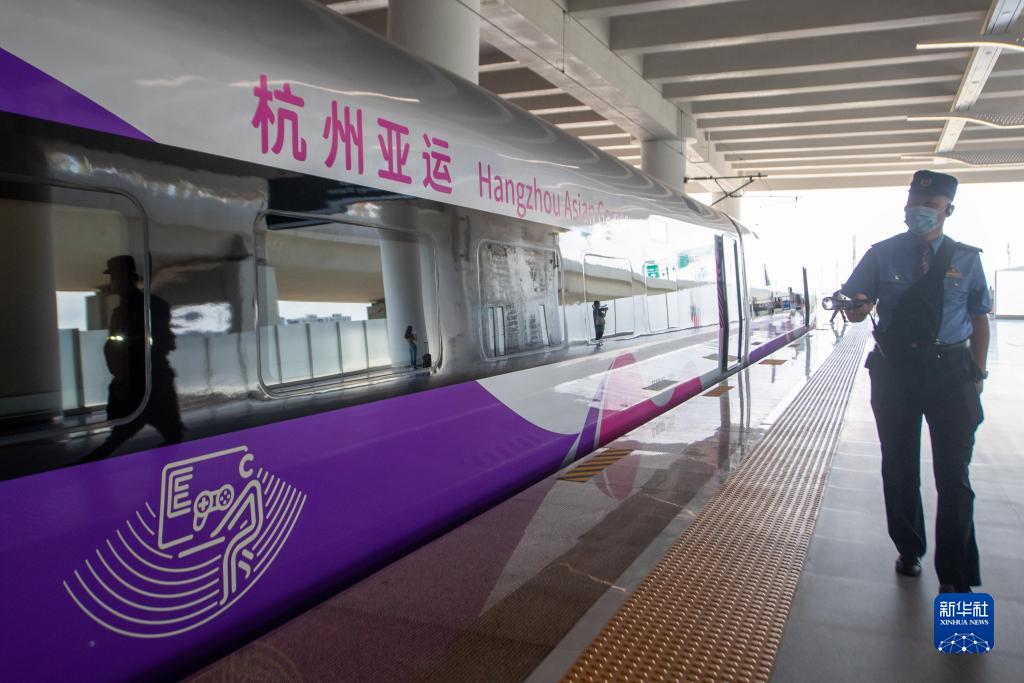 当日,由浙江交通集团购置、为杭州第19届亚运会量身定制的复兴号亚运智能动车组搭载近百名乘客从杭州西站出发,在合杭高铁湖杭段开启首次试乘活动。复兴号亚运智能动车组采用杭州亚运会主形象色“虹韵紫”涂装,针对浙江多丘陵山地的地形特点采用定制化的技术创新方案,提升了乘客的乘坐舒适度,将在杭州亚运会赛事期间承担重要的交通转运功能。