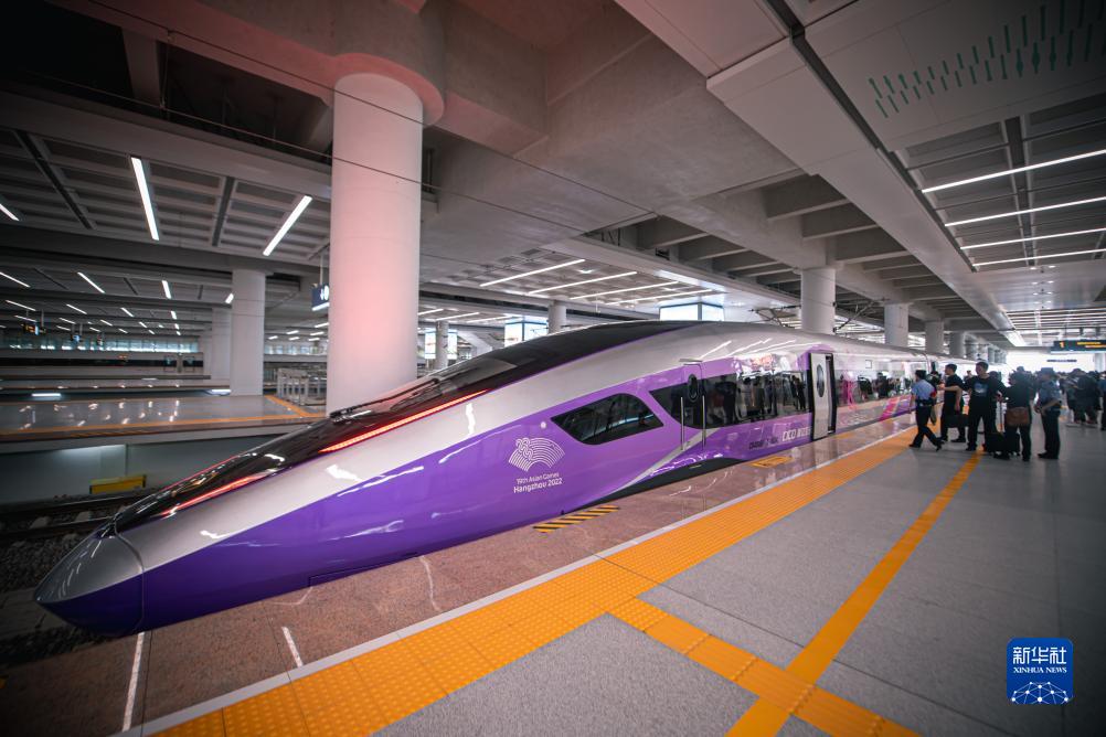当日,由浙江交通集团购置、为杭州第19届亚运会量身定制的复兴号亚运智能动车组搭载近百名乘客从杭州西站出发,在合杭高铁湖杭段开启首次试乘活动。复兴号亚运智能动车组采用杭州亚运会主形象色“虹韵紫”涂装,针对浙江多丘陵山地的地形特点采用定制化的技术创新方案,提升了乘客的乘坐舒适度,将在杭州亚运会赛事期间承担重要的交通转运功能。