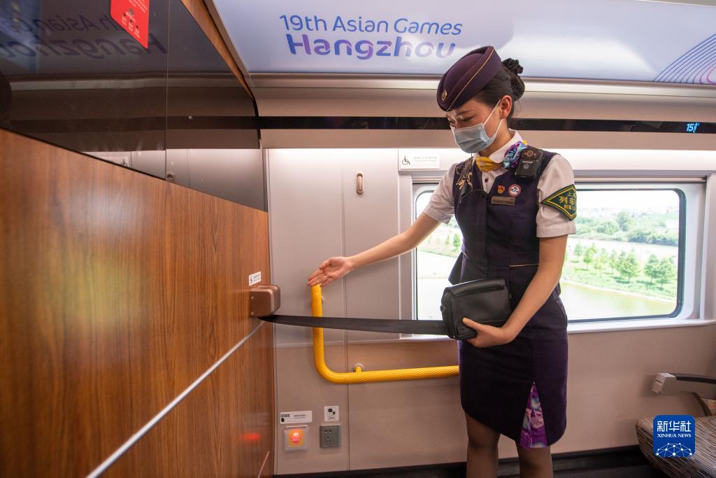 8月4日,铁路杭州客运段乘务员展示复兴号亚运智能动车组车厢内的无障碍设施——轮椅固定处。