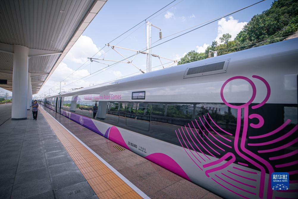 当日,由浙江交通集团购置、为杭州第19届亚运会量身定制的复兴号亚运智能动车组搭载近百名乘客从杭州西站出发,在合杭高铁湖杭段开启首次试乘活动。复兴号亚运智能动车组采用杭州亚运会主形象色“虹韵紫”涂装,针对浙江多丘陵山地的地形特点采用定制化的技术创新方案,提升了乘客的乘坐舒适度,将在杭州亚运会赛事期间承担重要的交通转运功能。