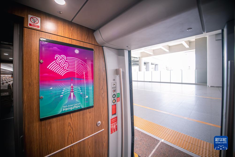 复兴号亚运智能动车组车厢门口挂有杭州亚运会海报装饰(8月4日摄)。