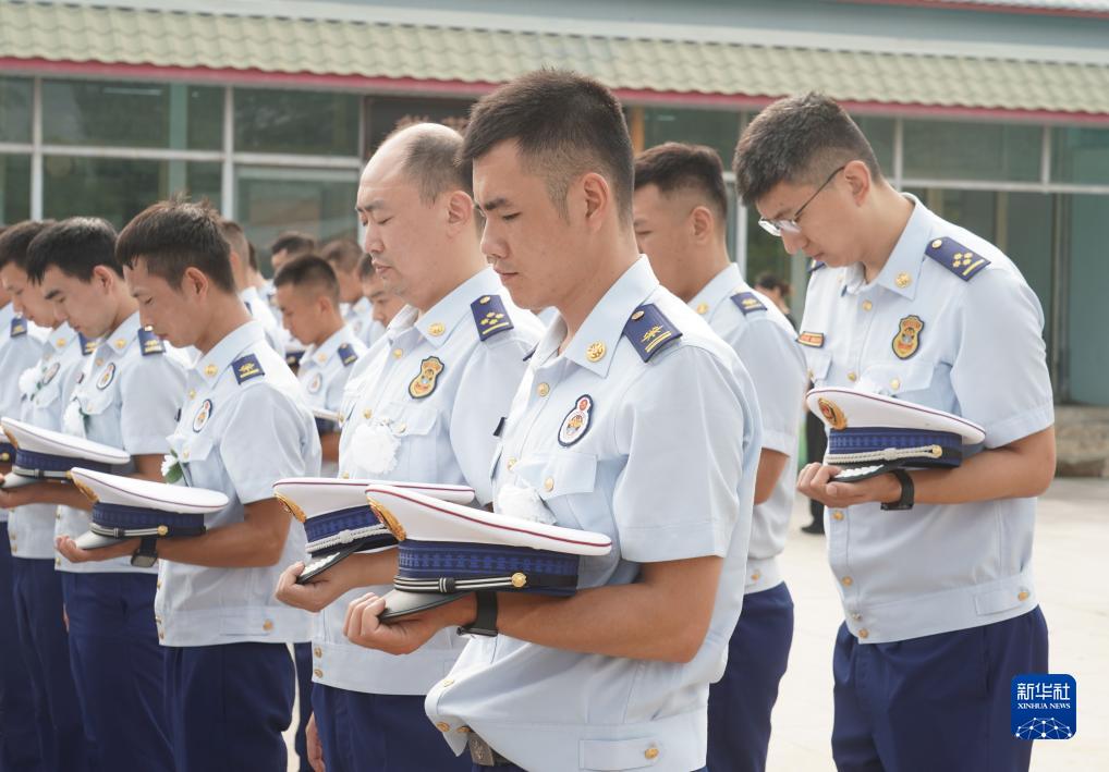 8月4日,消防指战员在冯振烈士遗体告别仪式现场默哀。