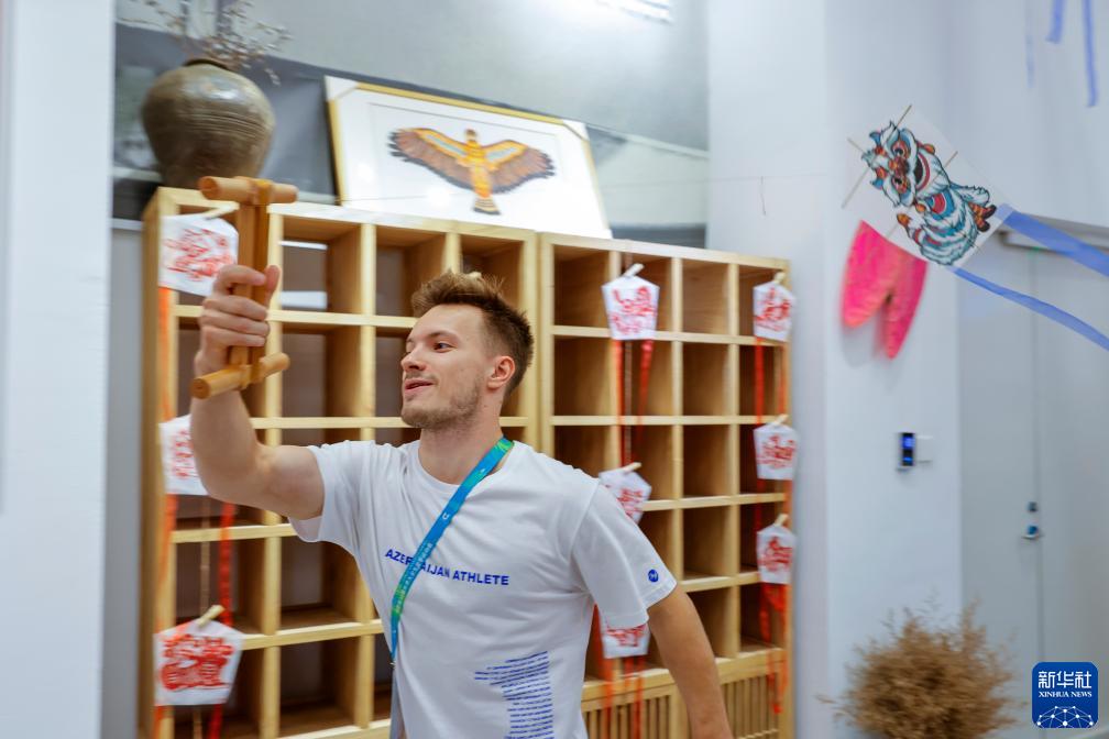 8月3日,在成都大运村的互动体验中心,阿塞拜疆运动员尼基塔·西蒙诺夫体验他亲手制作的彭州敖平风筝。
