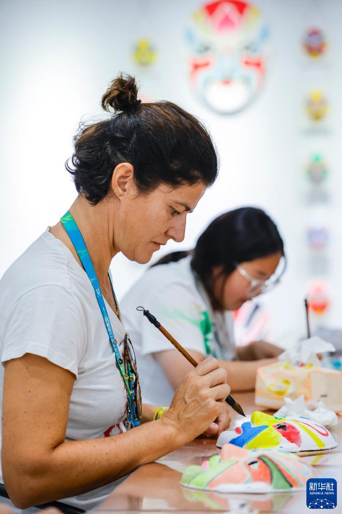 8月2日,在成都大运村的互动体验中心,意大利代表团成员费代丽卡·弗雷迪亚尼(左)绘制中国戏剧脸谱。