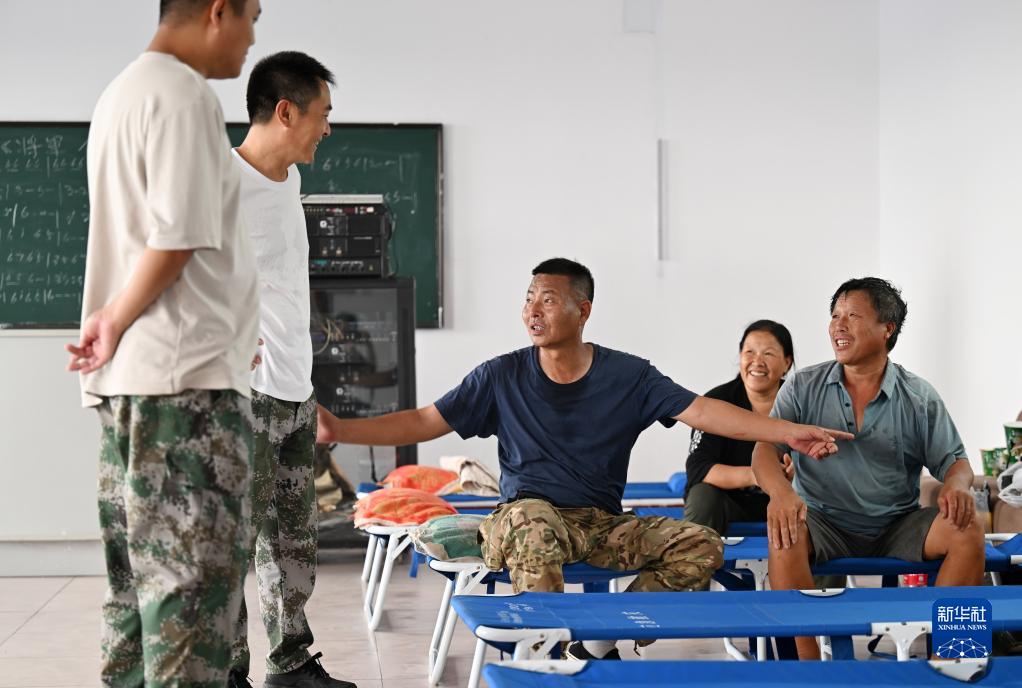 8月4日,郝庆水(左三)和村干部一起在第六埠村安置点和群众交流。