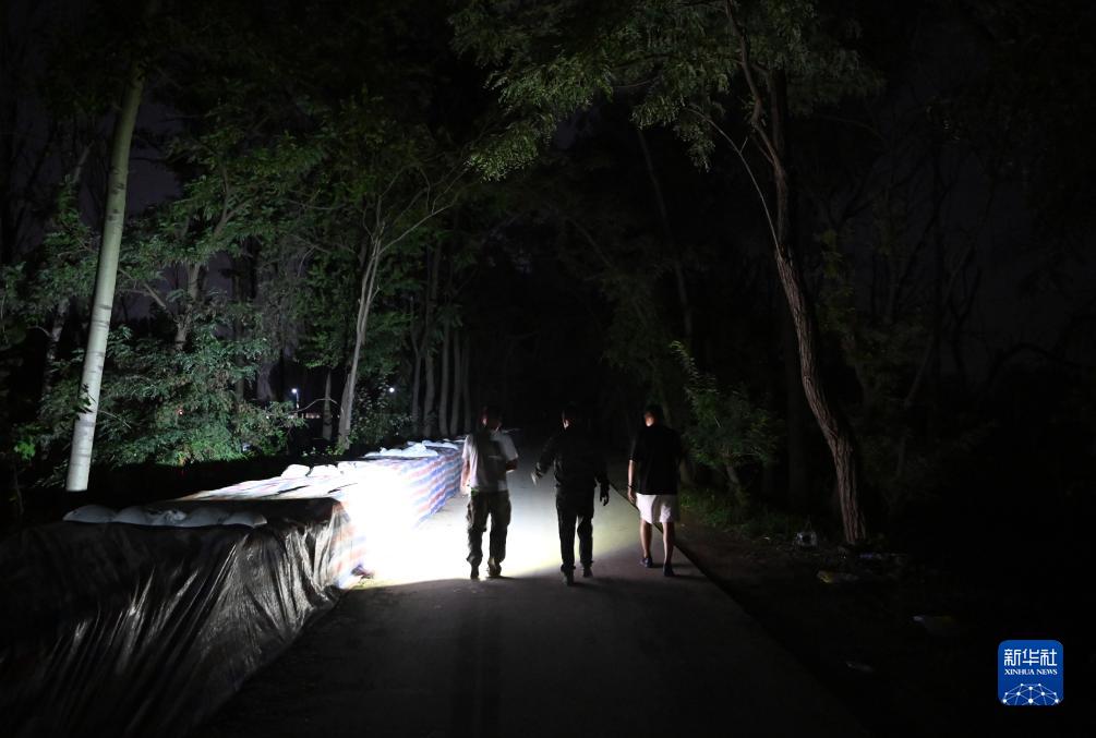 郝庆水(左一)和村干部一起巡视河堤(8月3日摄)。
