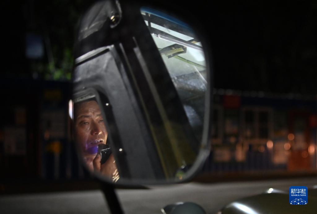 郝庆水在车内用对讲机安排抗洪工作(8月3日摄)。