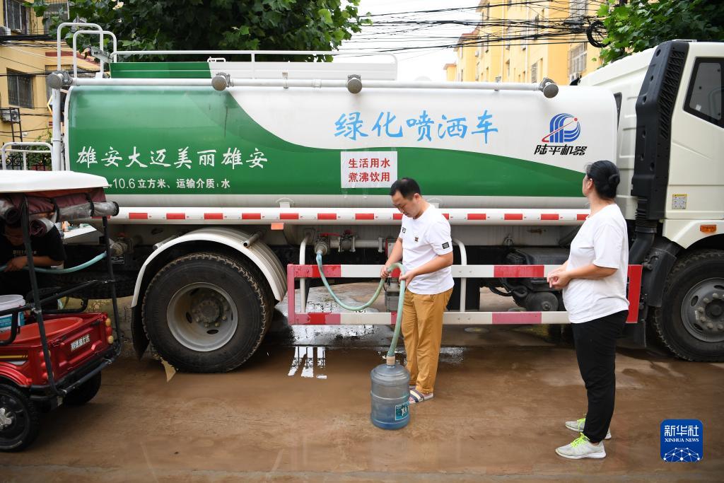 为缓解灾后城镇居民用水难题,目前,河北省涿州市已完成两个临时制水供水站点建设,站点内制水、检测、调试、出水工作已完成。同时,涿州市利用各地市支援的供水罐装车辆,为严重缺水地区供给生活用水。
