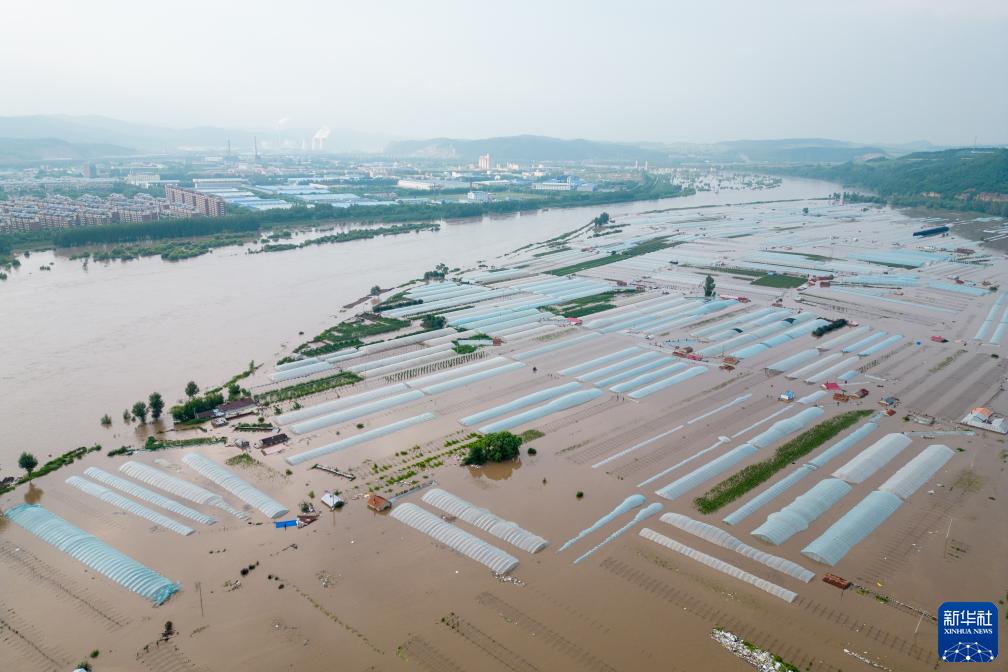 这是8月4日拍摄的黑龙江省牡丹江市铁岭河牡丹江公路大桥段被淹的房屋和大棚(无人机照片)。