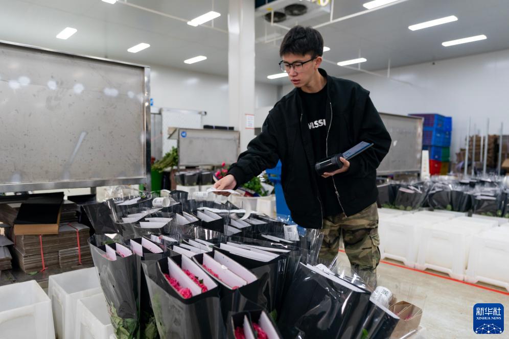 在云天化晋宁花卉产业现代化示范园内,一名工作人员在为包装好的鲜花打印标签(7月12日摄)。新华社记者 陈欣波 摄
