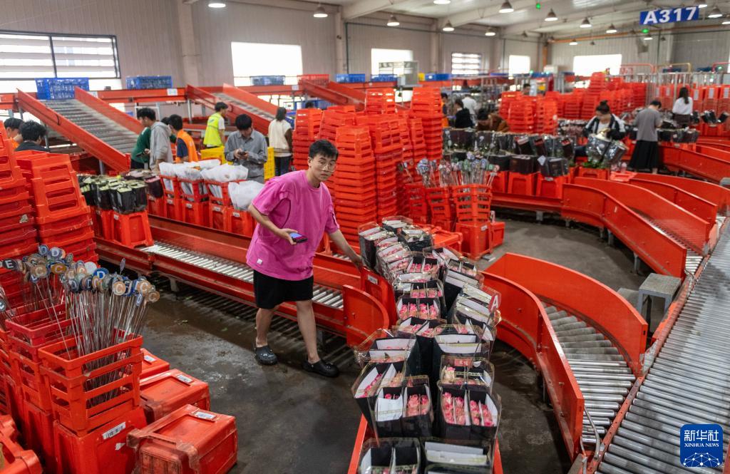 在昆明国际花卉拍卖交易中心,一名质检员将质检分级后的鲜花推入传送带(7月13日摄)。新华社记者 陈欣波 摄