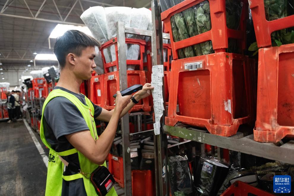 一名工作人员在昆明国际花卉拍卖交易中心内对台车上存放的鲜花进行扫码(7月13日摄)。新华社记者 陈欣波 摄
