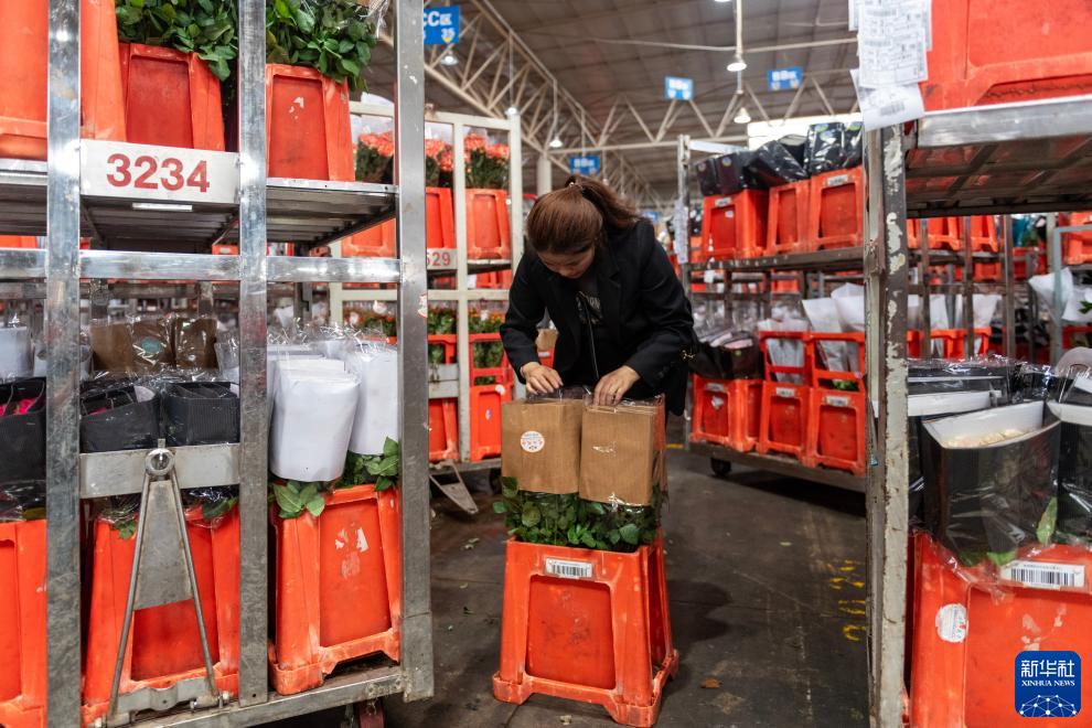 一名花商在昆明国际花卉拍卖交易中心提货区查看自己拍得的鲜花(7月13日摄)。新华社记者 陈欣波 摄