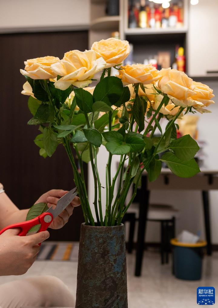 8月3日,一位昆明市民在家中修剪花枝。新华社记者 陈欣波 摄