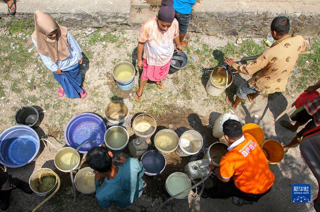 8月3日,在印度尼西亚西爪哇省茂物,人们在送水车前排队等候打水。