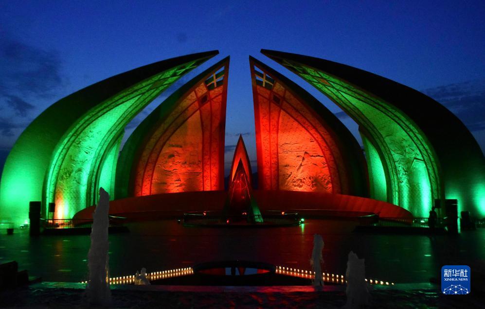 7月29日,巴基斯坦首都伊斯兰堡的巴基斯坦纪念碑亮起中巴两国国旗颜色的灯光,庆祝中巴经济走廊启动十周年。