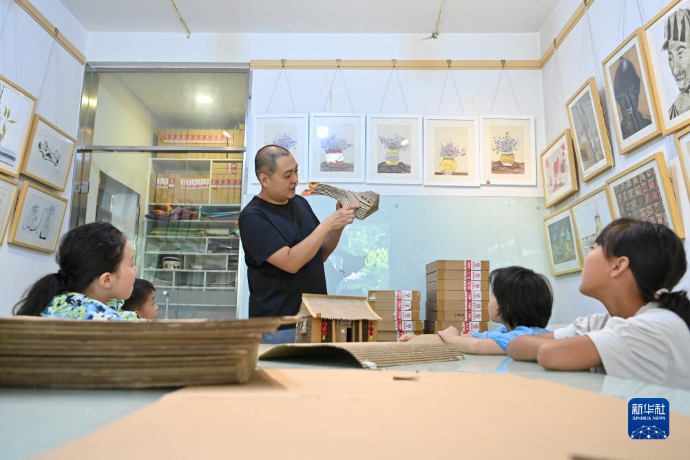 在位于山西省太原市万柏林区的工作室内,王帅栋和小朋友们分享瓦楞纸作品背后的地理知识(8月4日摄)。