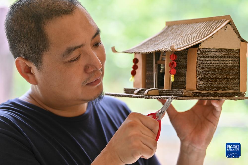 王帅栋在位于山西省太原市万柏林区的工作室内修整瓦楞纸作品(8月1日摄)。