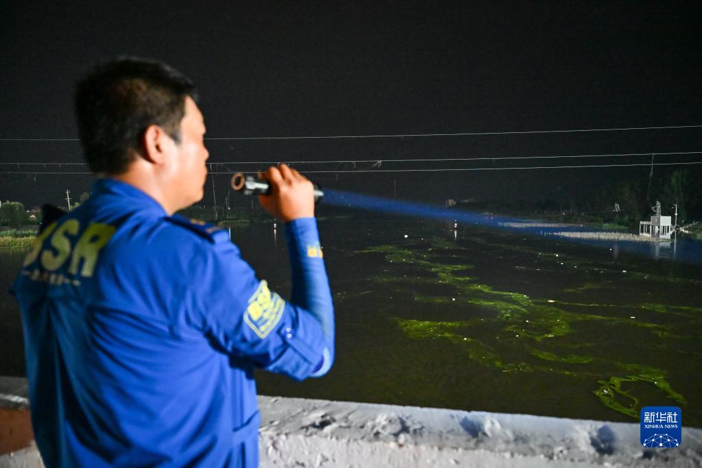 8月4日,天津静海蓝天救援队队员在天津市静海区台头镇革命桥上观测桥下洪水情况。