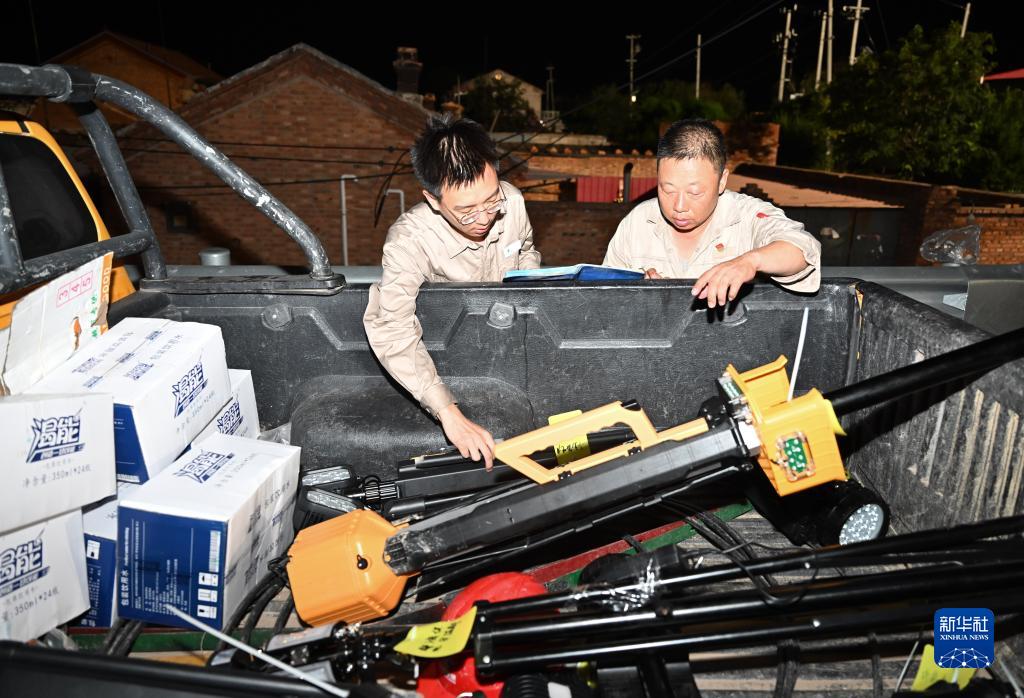 8月4日,国网天津电力工程抢险人员在天津市静海区台头镇现场核对应急照明灯具准备情况。