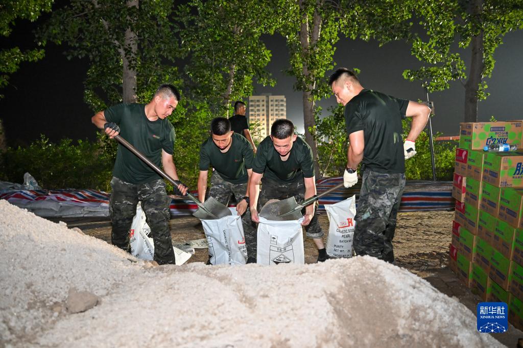 8月4日,武警天津总队官兵在大清河天津静海段南堤上进行岸堤加固作业。