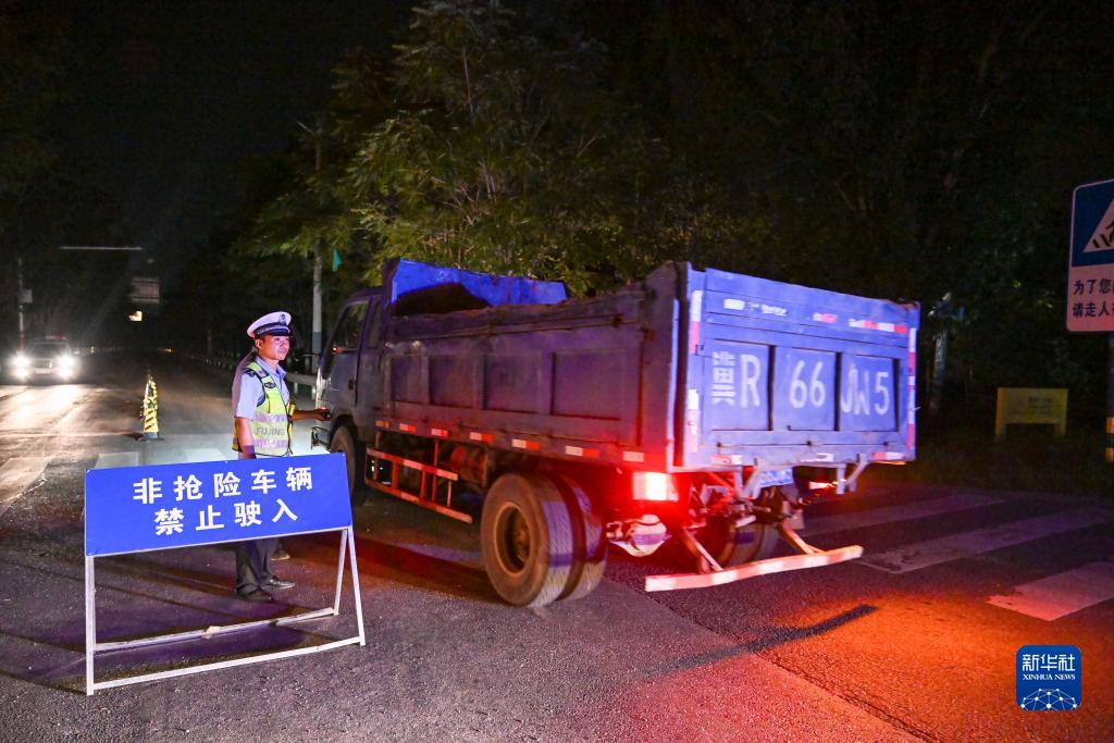 8月4日,天津市公安局静海分局执勤交警在台头镇入镇卡口处指挥抢险车辆进入。