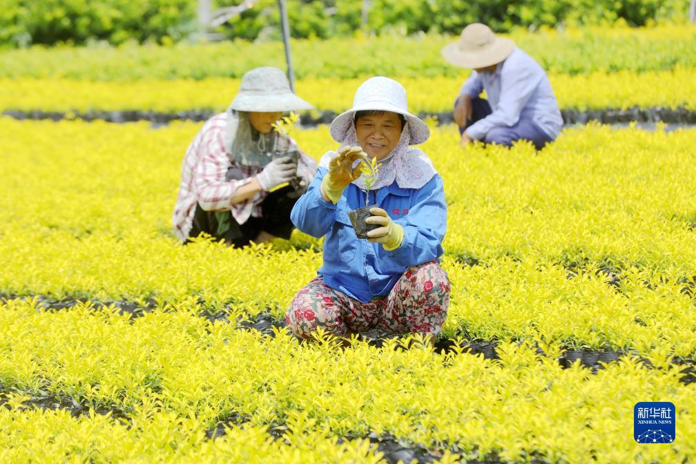 8月5日,在浙江省湖州市德清县雷甸镇双溪村苗木种植基地,农民在管护苗木。