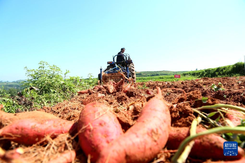8月4日,河南省洛阳市汝阳县刘店镇在沙坪村举行红薯收获现场会,农民驾驶机械在收获红薯。