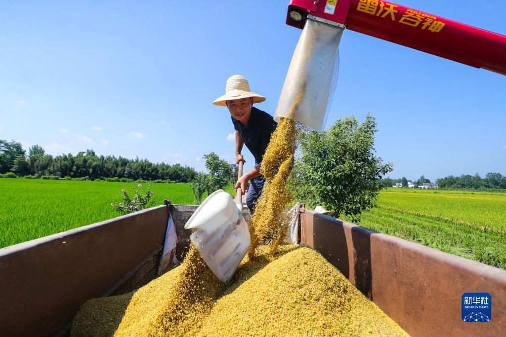 8月4日,河南省信阳市光山县南向店乡何畈村鑫磊合作社社员在抢收头茬再生水稻。