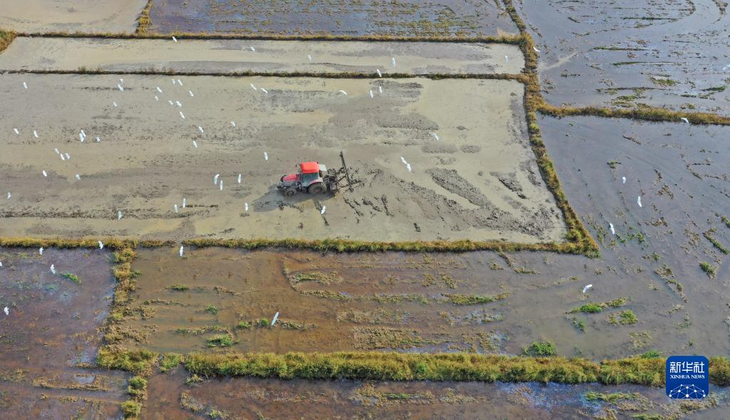 8月5日,浙江省台州市仙居县白塔镇,农户在翻犁农田,准备播种晚稻(无人机照片)。
