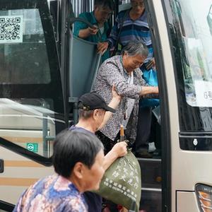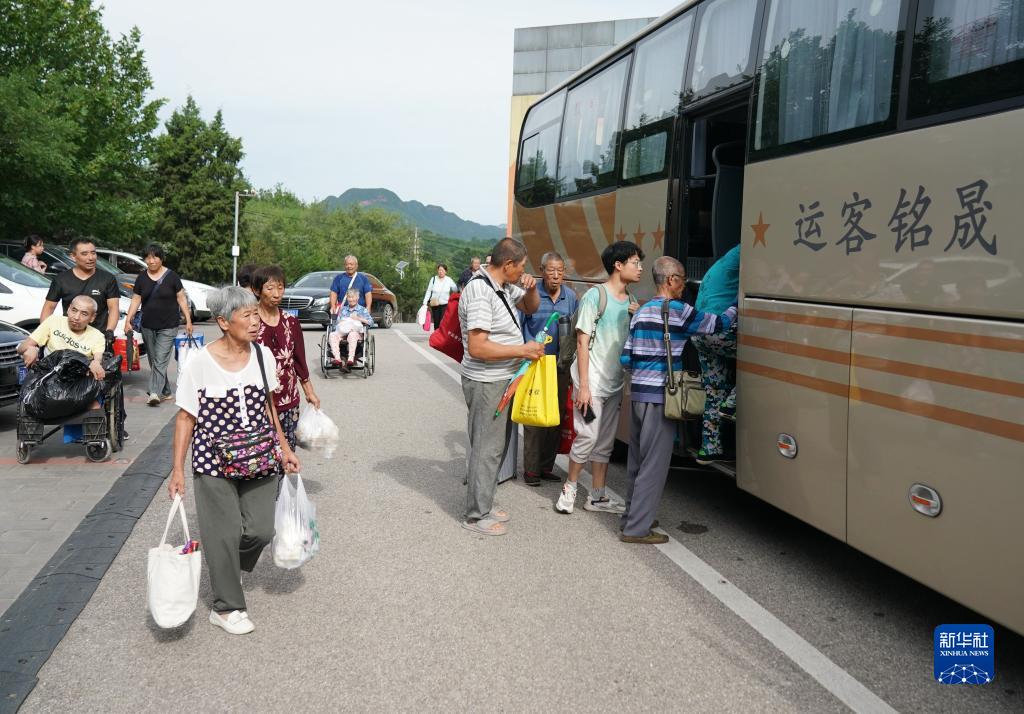 8月5日,北京市房山区青龙湖镇口头村村民在安置点登上接他们回家的大巴。