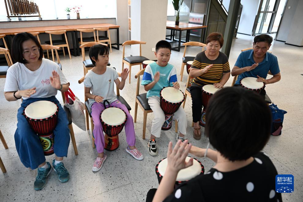 8月5日,市民在艺术课堂上学习非洲鼓演奏。