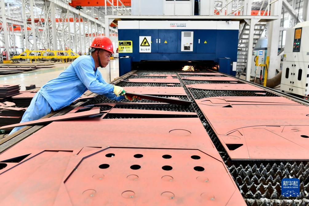 8月5日,在德誉精工科技(日照)有限公司,工作人员在查看激光设备切割后的钢板。