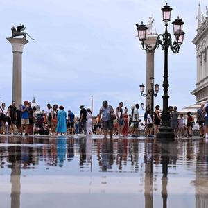 8月4日,游客走在意大利威尼斯积水的道路上。