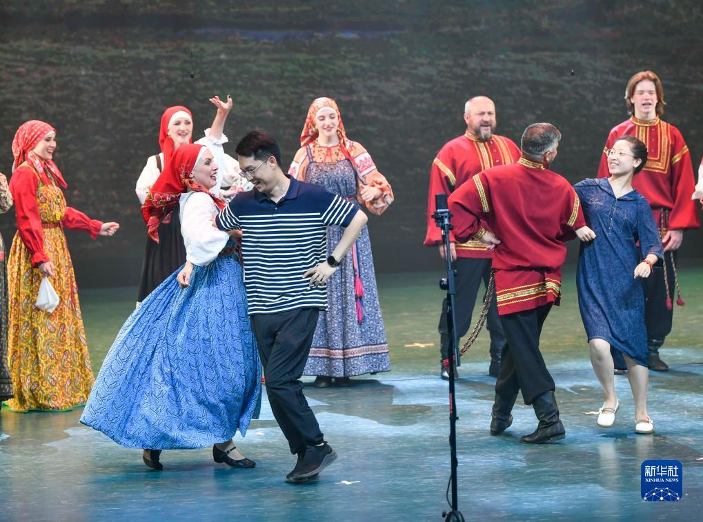 在乌鲁木齐晚报剧院,俄罗斯萨拉托夫州曙光歌舞团的演员们邀请现场观众同台共舞(7月22日摄)。