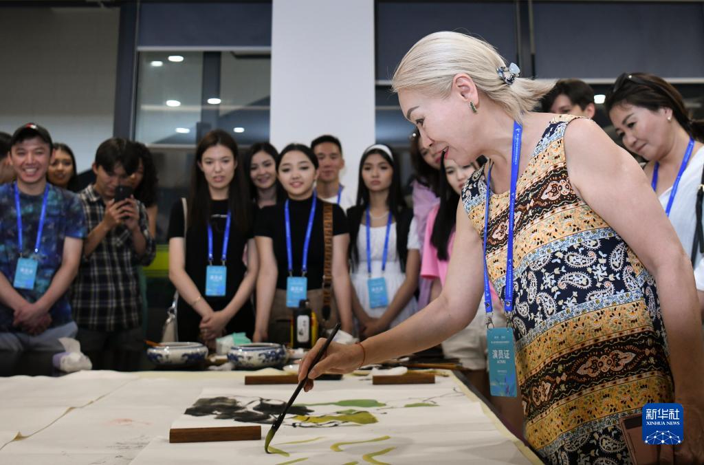 在新疆美术馆,吉尔吉斯斯坦国立白鹿舞蹈团演职人员在体验中国画(7月28日摄)。