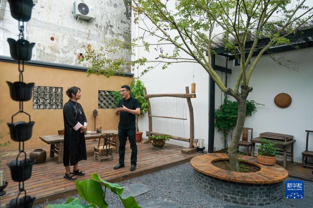 在苏州市树山村一家民宿内,乡村规划师彭锐(右)和民宿主理人俞慧在聊天交流(7月14日摄)。