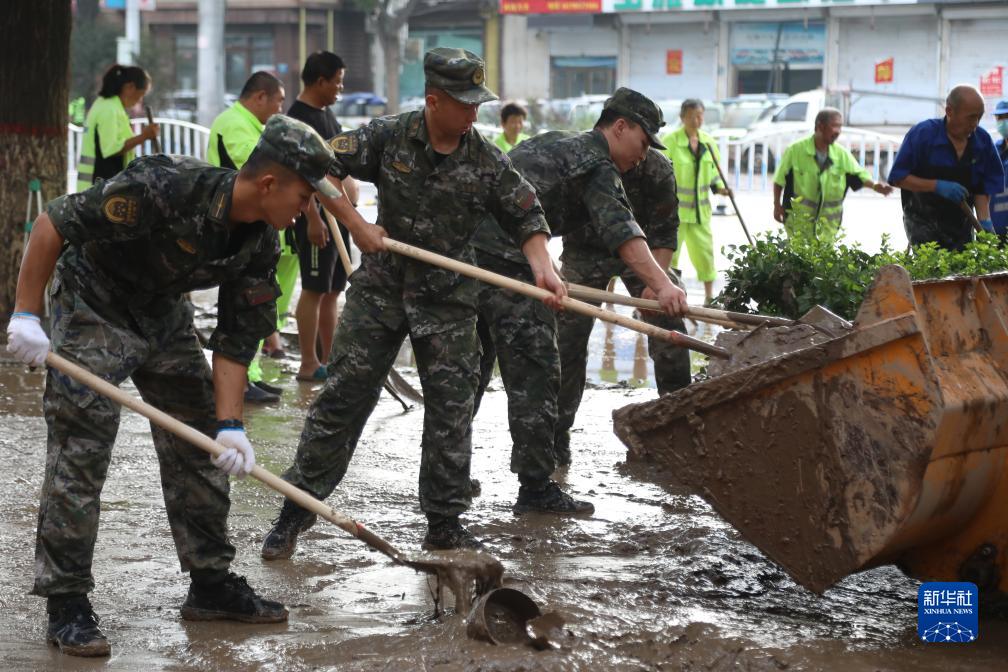 8月5日,武警河北总队保定支队官兵在涿州市城西107国道沿线清理淤泥。新华社发(王红强 摄)