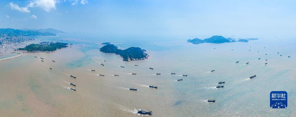 8月6日,浙江省温岭市石塘镇钓浜渔港,大批渔船驶向大海(无人机照片)。