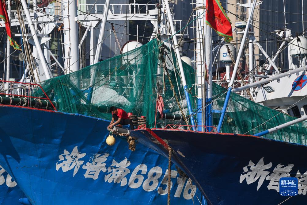 8月6日,停泊在舟山普陀沈家门渔港的渔船上的渔民们在为当天的开渔做准备工作。