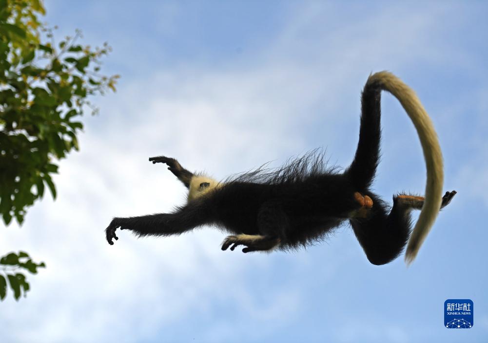 一只白头叶猴在林间跳跃(8月5日摄)。