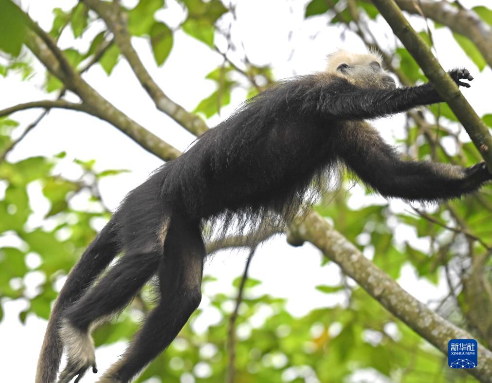 一只白头叶猴在林间跳跃(8月5日摄)。