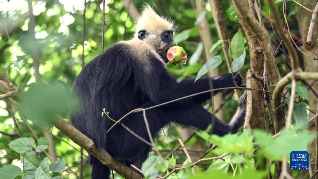 一只白头叶猴在吃番石榴(8月4日摄)。